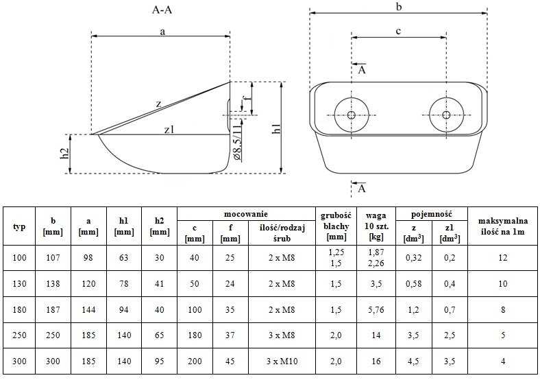 Wymiary produkowanych przez nas czerpaków.